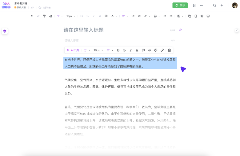 9466创作助手,集素材收集管理、一键AI创作、海量样式与模板、内容合规检测、多平台一键同步等多种创作能力于一体,让高质量新媒体文稿创作再无门槛