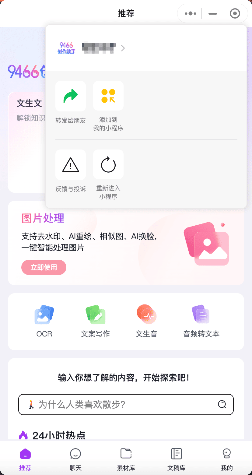 用户打开微信,搜索“9466 创作助手”小程序并打开,如需登陆则输入账号信息完成登陆,即可开始使用。