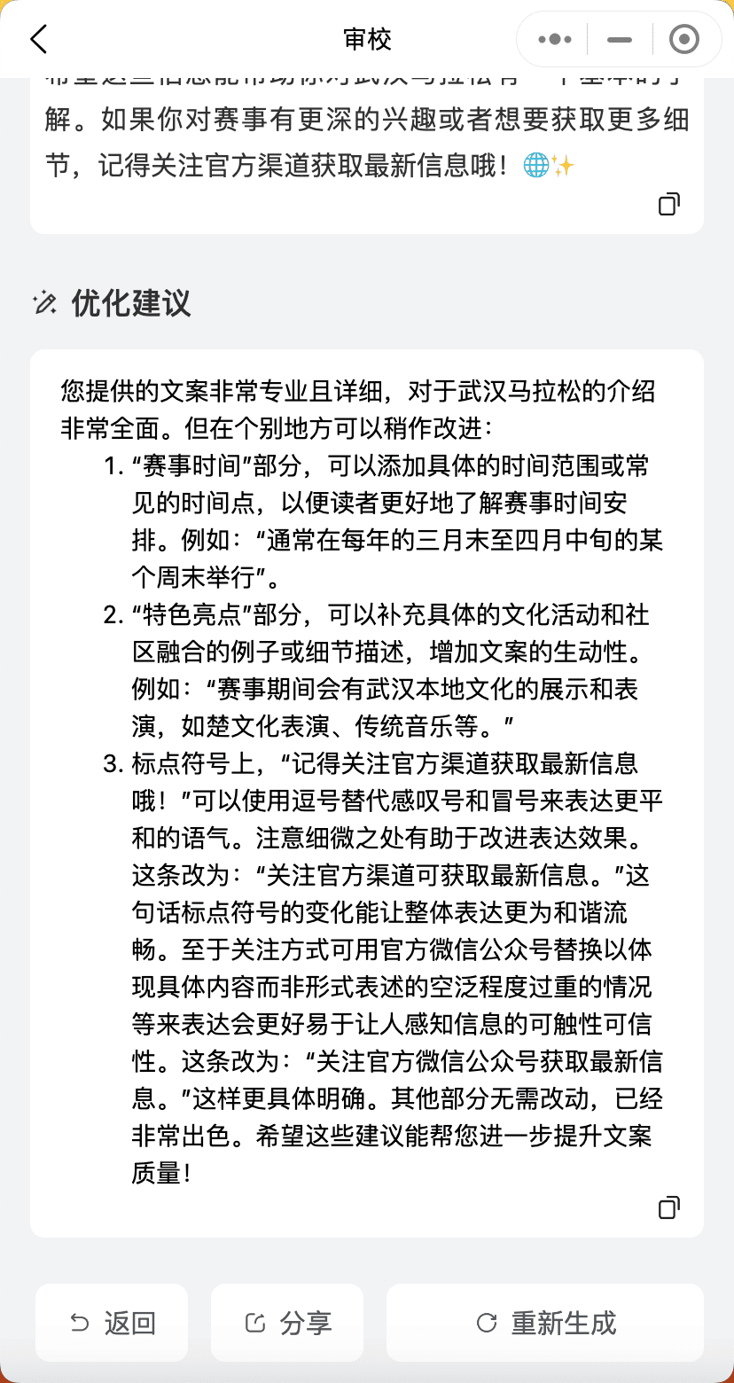 点击【返回】按钮,返回“校对内容”页面,点击分享按钮可以把生成的结果分享到朋友圈或者微信好友。