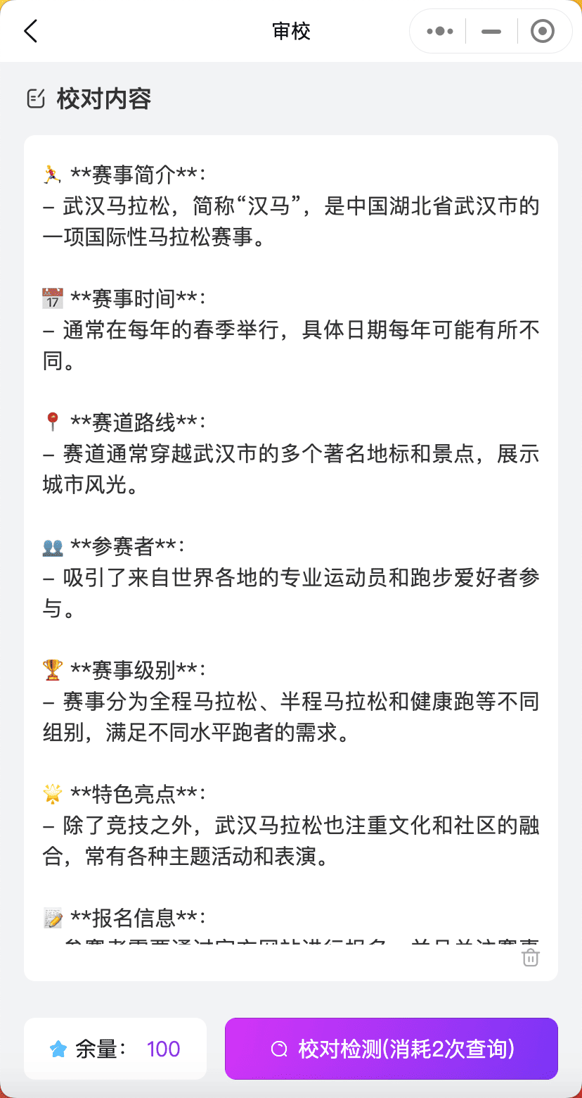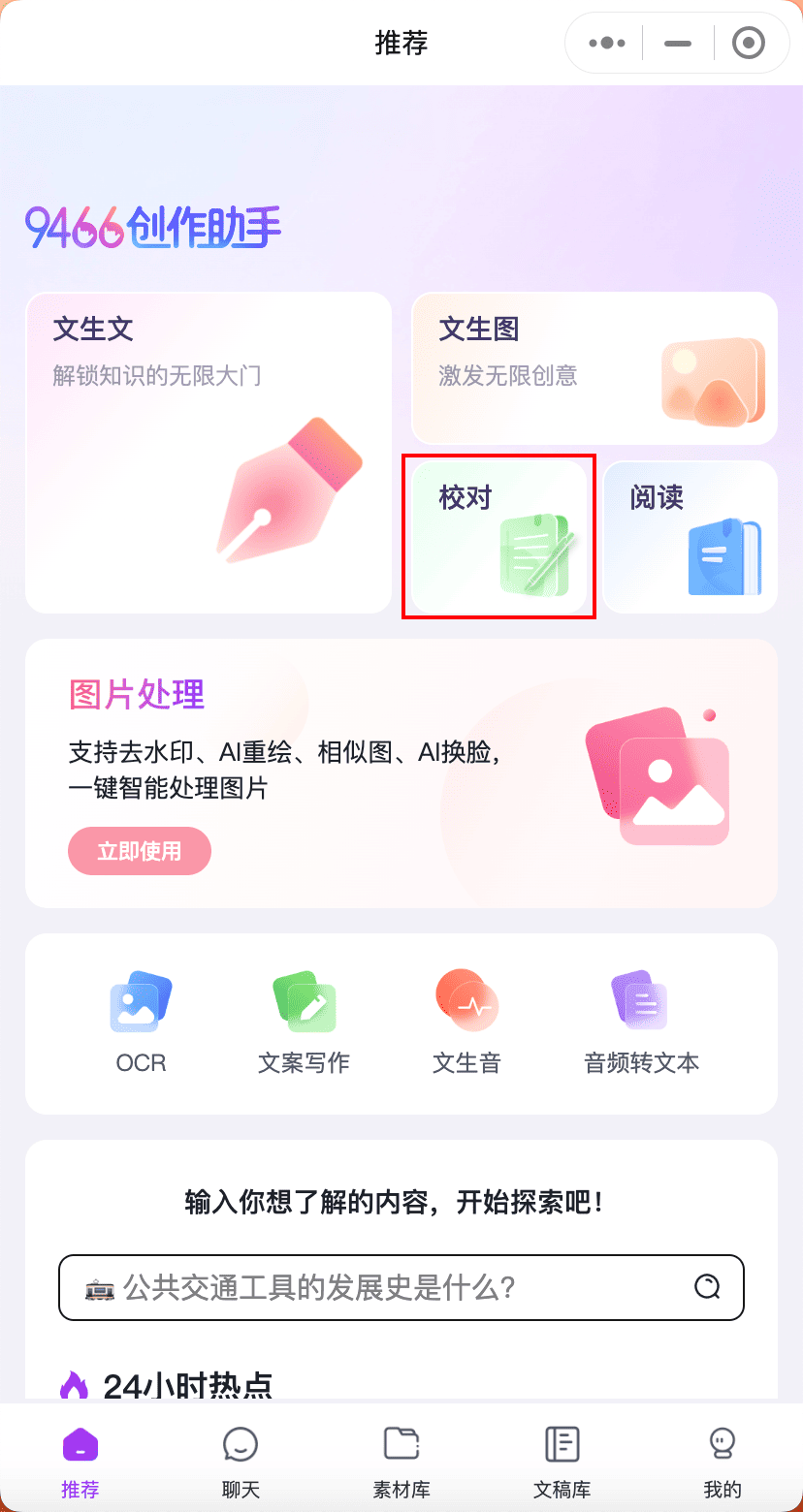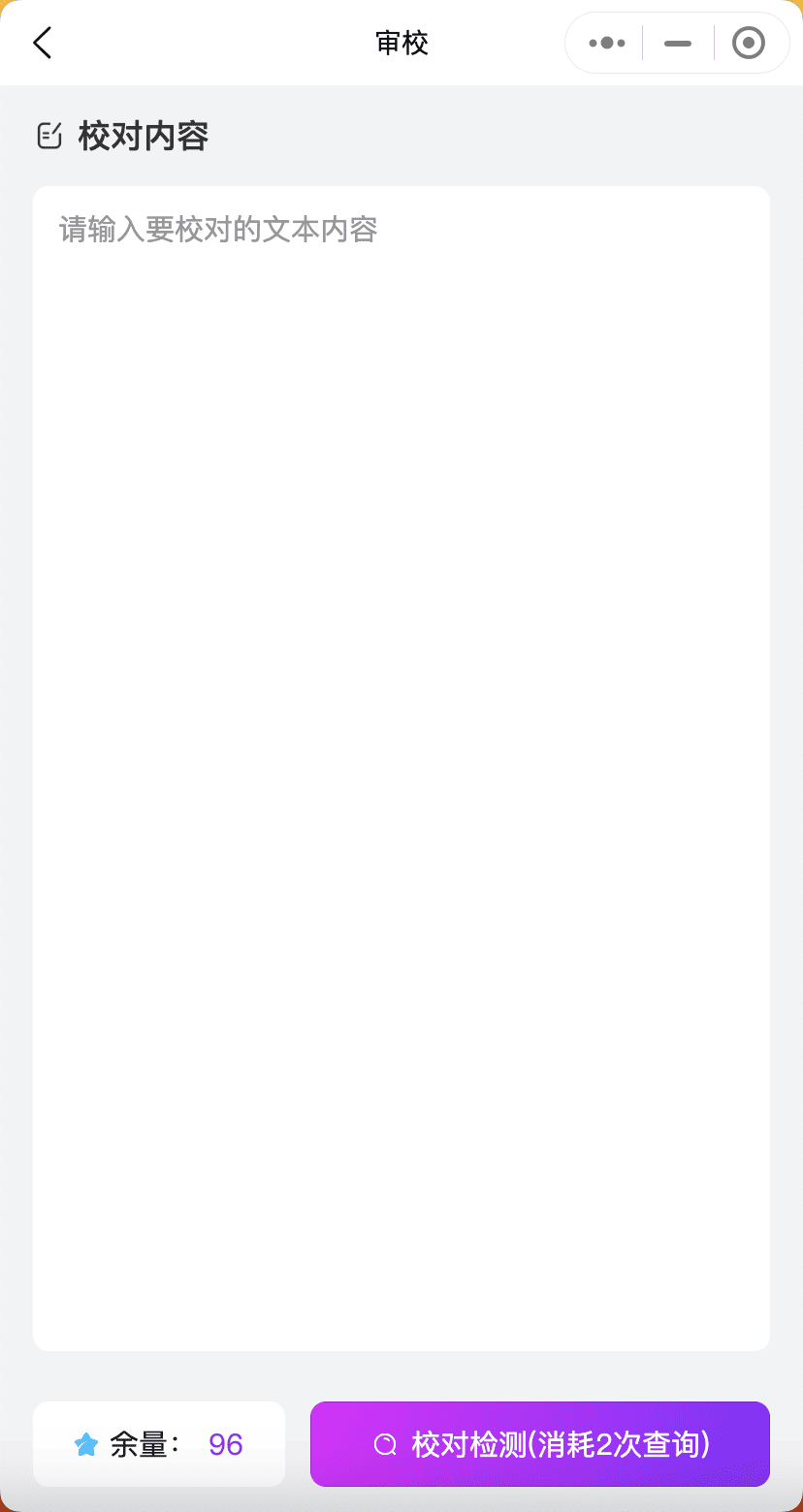 在“推荐”页面,点击【校对】模块,进入到“校对”页面,将需要校对的内容粘贴到相应的文本框内,点击【校对检测】按钮,进行校对,「优化建议」将在下方进行展示。