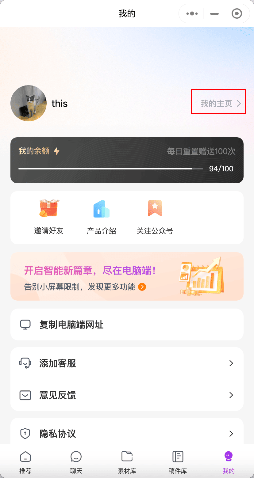 完善个人主页,可以获得每日 100 次免费使用次数的福利。