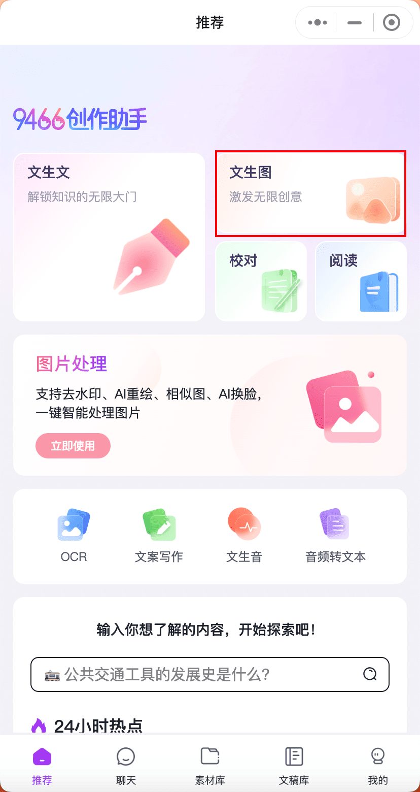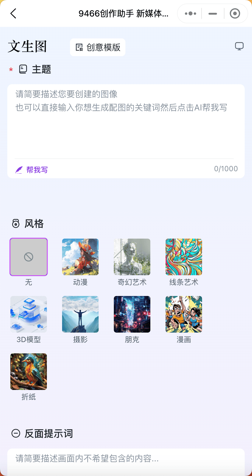 在“推荐”页面点击【文生图】进入到页面,您可以输入「主题」简要描述您要创建的图形,选择生成图形的「风格」,您也可以输入「反面提示词」描述画面内不希望出现的词语。