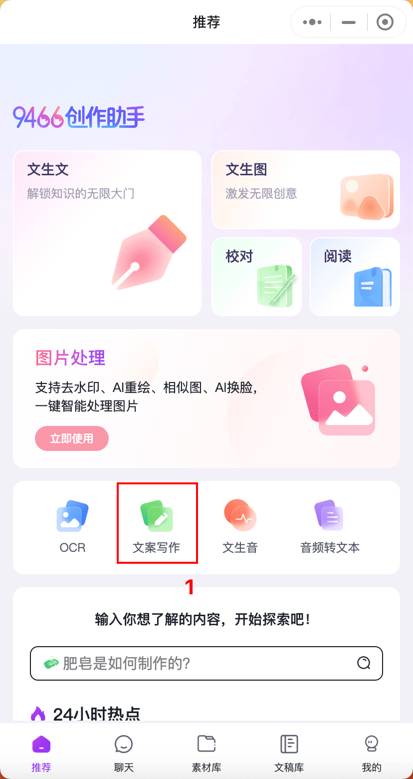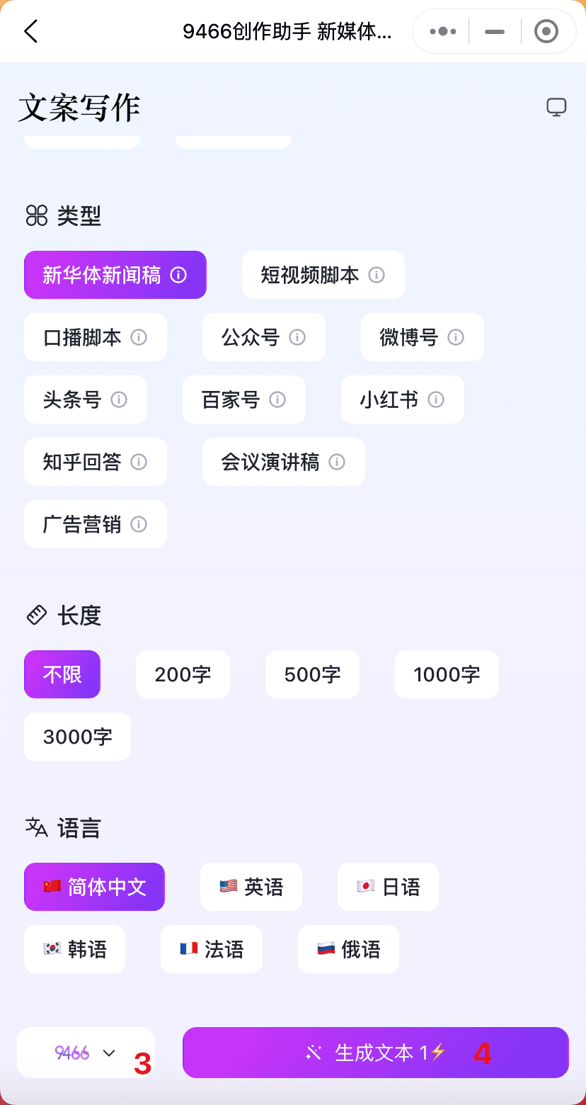 点击【写作】模块,进入“文案写作”页面,输入想要写作的主题,选择相应的参数点击“生成文本”即可生成文案。